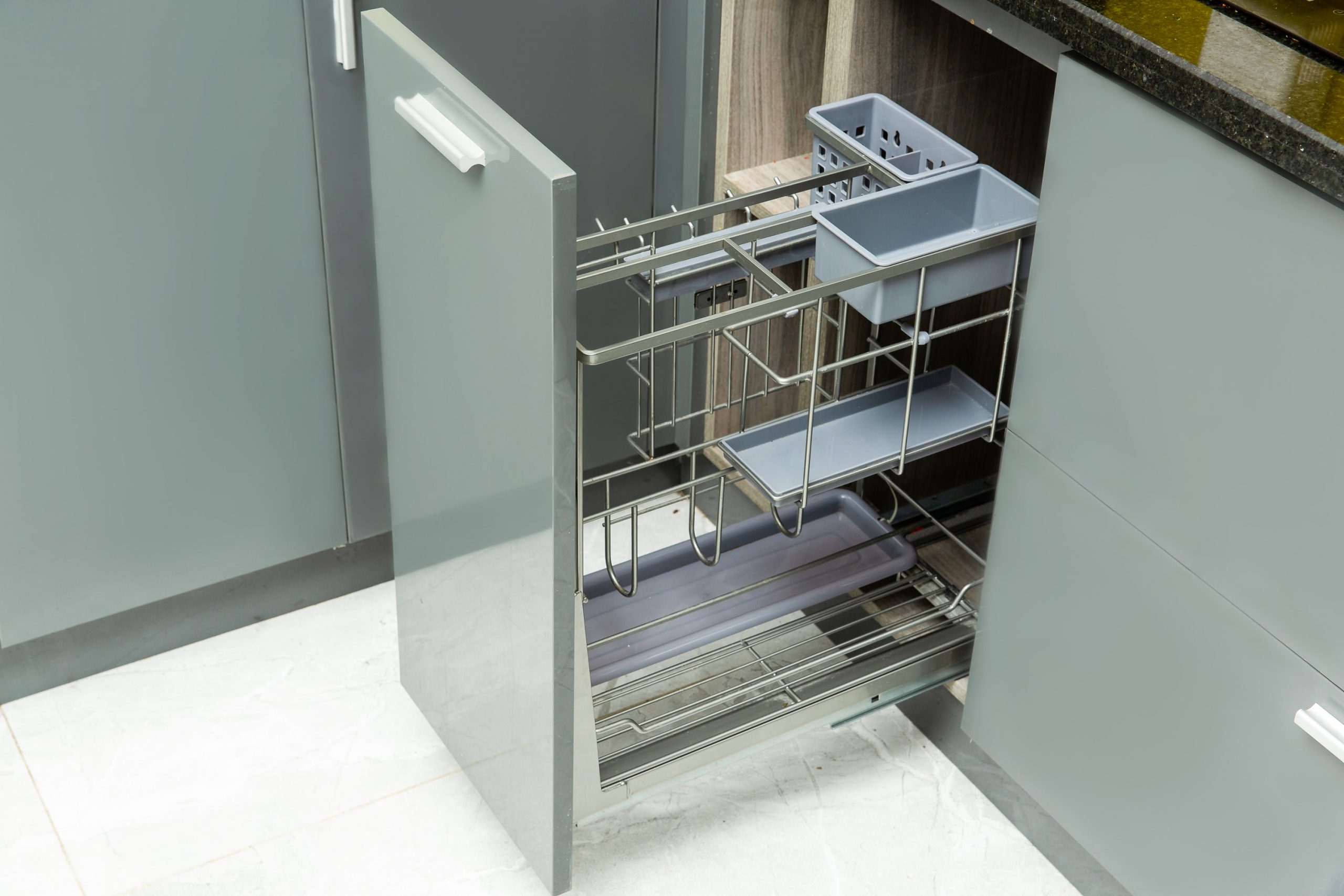 - Sử dụng rổ kệ gia vị: Sử dụng hệ thống ngăn kéo gia vị thay vì tủ hoặc khay trên bàn bếp cho phép bạn dễ dàng nhìn thấy mọi loại gia vị, mà không chiếm diện tích mặt bàn bếp. Loại rổ kệ này thường được lắp đặt ở tủ bếp dưới, gần bếp nấu.